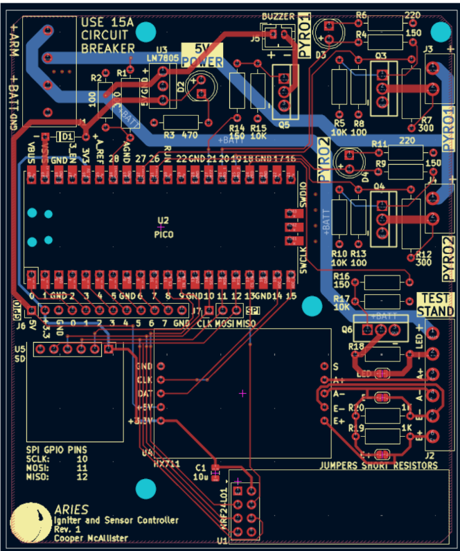 ARIES (Advanced Remote Ignition and Evaluation System) is the computer system designed to record data during static test fires of experimental motors. This was created to replace the previous Compact Remote Ignition System (CRIS), which had been destroyed in a testing incident. CRIS, though useful for ignition, did not have a means of logging data during a static test fire, so ARIES was also created to accomodate this need.